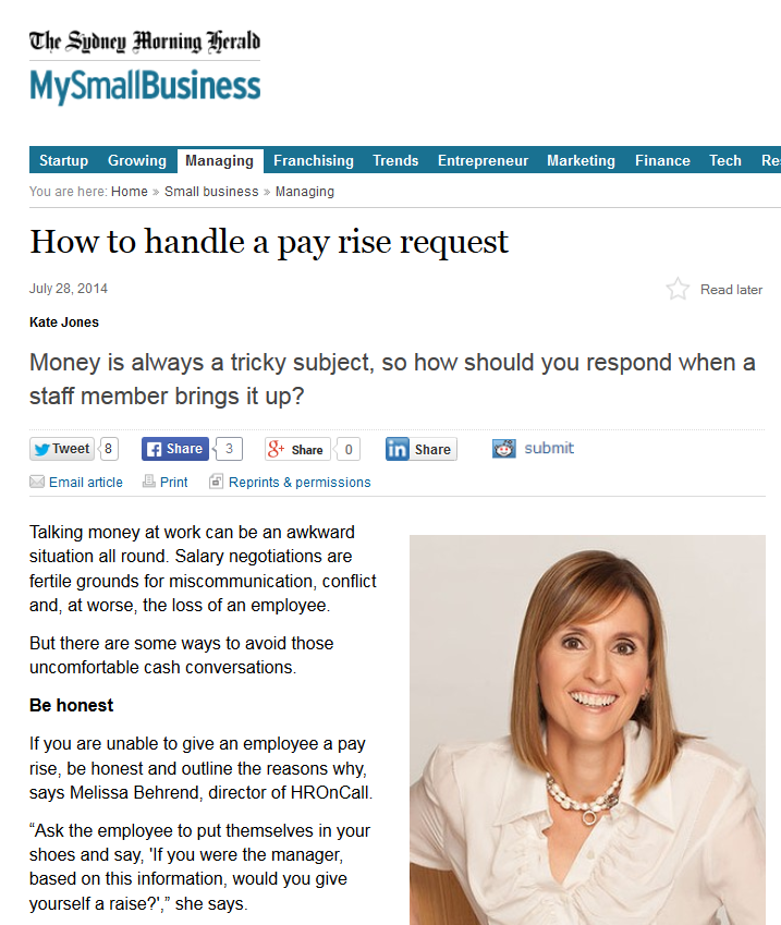 Melissa Behrend the Director of HR On Call is interviewed for an article for the Sydney Morning Herald titled "How to handle a pay rise request".  The article featured in the small business section of the paper in late July.   Follow the link to read the complete article.